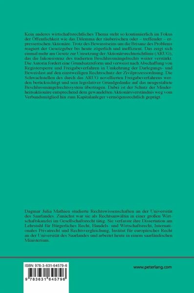 Kein anderes wirtschaftsrechtliches Thema steht so kontinuierlich im Fokus der Öffentlichkeit wie das Dilemma der räuberischen oder - treffender - erpresserischen Aktionäre. Trotz des Bewusstseins um die Brisanz des Problems reagiert der Gesetzgeber bis heute zögerlich und ineffizient. Das zeigt sich einmal mehr am Gesetz zur Umsetzung der Aktionärsrechterichtlinie (ARUG), das die Inkonsistenz des tradierten Beschlussmängelrechts weiter verstärkt. Die Autorin fordert eine Grundsatzreform und verweist nach Abschaffung von Registersperre und Freigabeverfahren in Umkehrung der Darlegungs- und Beweislast auf den einstweiligen Rechtsschutz der Zivilprozessordnung. Die Schwachstellen des durch das ARUG novellierten Freigabeverfahrens werden berücksichtigt und sein legislativer Grundgedanke auf das neugestaltete Beschlussmängelrechtssystem übertragen. Dabei ist der Schutz der Minderheitsaktionäre entsprechend dem gewandelten Aktionärsverständnis weg vom Verbandsmitglied hin zum Kapitalanleger vermögensrechtlich geprägt.