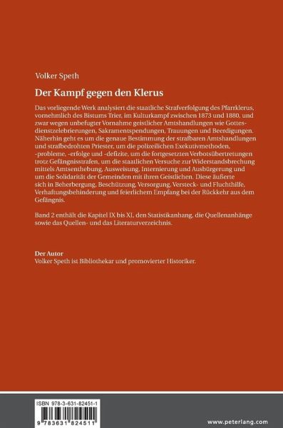 Das vorliegende Werk analysiert die staatliche Strafverfolgung des Pfarrklerus, vornehmlich des Bistums Trier, im Kulturkampf zwischen 1873 und 1880, und zwar wegen unbefugter Vornahme geistlicher Amtshandlungen wie Gottesdienstzelebrierungen, Sakramentspendungen, Trauungen und Beerdigungen. Näherhin geht es um die genaue Bestimmung der strafbaren Amtshandlungen und strafbedrohten Priester, um die polizeilichen Exekutivmethoden, -probleme, -erfolge und -defizite, um die fortgesetzten Verbotsübertretungen trotz Gefängnisstrafen, um die staatlichen Versuche zur Widerstandsbrechung mittels Amtsenthebung, Ausweisung, Internierung und Ausbürgerung und um die Solidarität der Gemeinden mit ihren Geistlichen. Diese äußerte sich in Beherbergung, Beschützung, Versorgung, Versteck- und Fluchthilfe, Verhaftungsbehinderung und feierlichem Empfang bei der Rückkehr aus dem Gefängnis.