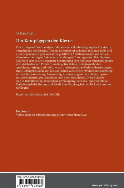 Das vorliegende Werk analysiert die staatliche Strafverfolgung des Pfarrklerus, vornehmlich des Bistums Trier, im Kulturkampf zwischen 1873 und 1880, und zwar wegen unbefugter Vornahme geistlicher Amtshandlungen wie Gottesdienstzelebrierungen, Sakramentspendungen, Trauungen und Beerdigungen. Näherhin geht es um die genaue Bestimmung der strafbaren Amtshandlungen und strafbedrohten Priester, um die polizeilichen Exekutivmethoden, -probleme, -erfolge und -defizite, um die fortgesetzten Verbotsübertretungen trotz Gefängnisstrafen, um die staatlichen Versuche zur Widerstandsbrechung mittels Amtsenthebung, Ausweisung, Internierung und Ausbürgerung und um die Solidarität der Gemeinden mit ihren Geistlichen. Diese äußerte sich in Beherbergung, Beschützung, Versorgung, Versteck- und Fluchthilfe, Verhaftungsbehinderung und feierlichem Empfang bei der Rückkehr aus dem Gefängnis.