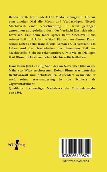 Italien im 16. Jahrhundert. Die Medici erlangen in Florenz zum zweiten Mal die Macht und Verdächtigen Niccolò Machiavelli einer Verschwörung. Er wird gefangen genommen und gefoltert, doch der Verdacht lässt sich nicht beweisen. Erst neun Jahre später kehrt Machiavelli aus seinem Exil zurück in die Stadt Florenz. An diesem Punkt seines Lebens setzt Hans Blums Roman an. Er versucht das Leben und die Geschehnisse der damaligen Zeit aus Machiavellis Sicht zu rekonstruieren. Mit vielen Dialogen lässt Blum die Leser am Leben Machiavellis teilhaben.