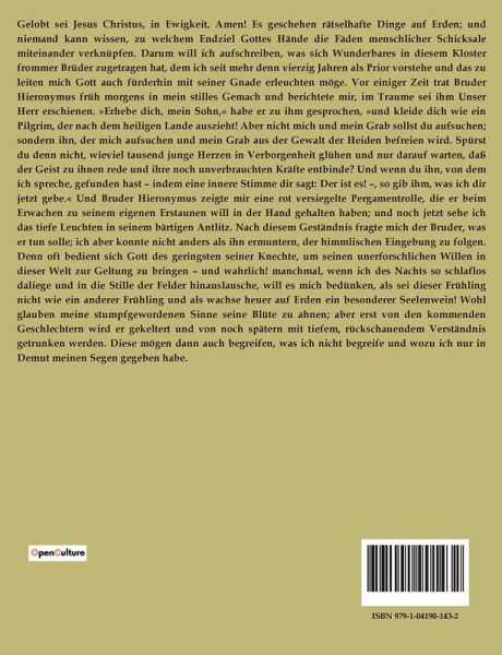 Gelobt sei Jesus Christus, in Ewigkeit, Amen! Es geschehen rätselhafte Dinge auf Erden; und niemand kann wissen, zu welchem Endziel Gottes Hände die Fäden menschlicher Schicksale miteinander verknüpfen. Darum will ich aufschreiben, was sich Wunderbares in diesem Kloster frommer Brüder zugetragen hat, dem ich seit mehr denn vierzig Jahren als Prior vorstehe und das zu leiten mich Gott auch fürderhin mit seiner Gnade erleuchten möge. Vor einiger Zeit trat Bruder Hieronymus früh morgens in mein stilles Gemach und berichtete mir, im Traume sei ihm Unser Herr erschienen. »Erhebe dich, mein Sohn,« habe er zu ihm gesprochen, »und kleide dich wie ein Pilgrim, der nach dem heiligen Lande auszieht! Aber nicht mich und mein Grab sollst du aufsuchen; sondern ihn, der mich aufsuchen und mein Grab aus der Gewalt der Heiden befreien wird. Spürst du denn nicht, wieviel tausend junge Herzen in Verborgenheit glühen und nur darauf warten, daß der Geist zu ihnen rede und ihre noch unverbrauchten Kräfte entbinde? Und wenn du ihn, von dem ich spreche, gefunden hast ¿ indem eine innere Stimme dir sagt: Der ist es! ¿, so gib ihm, was ich dir jetzt gebe.« Und Bruder Hieronymus zeigte mir eine rot versiegelte Pergamentrolle, die er beim Erwachen zu seinem eigenen Erstaunen will in der Hand gehalten haben; und noch jetzt sehe ich das tiefe Leuchten in seinem bärtigen Antlitz. Nach diesem Geständnis fragte mich der Bruder, was er tun solle; ich aber konnte nicht anders als ihn ermuntern, der himmlischen Eingebung zu folgen. Denn oft bedient sich Gott des geringsten seiner Knechte, um seinen unerforschlichen Willen in dieser Welt zur Geltung zu bringen ¿ und wahrlich! manchmal, wenn ich des Nachts so schlaflos daliege und in die Stille der Felder hinauslausche, will es mich bedünken, als sei dieser Frühling nicht wie ein anderer Frühling und als wachse heuer auf Erden ein besonderer Seelenwein! Wohl glauben meine stumpfgewordenen Sinne seine Blüte zu ahnen; aber erst von den kommenden Geschlechtern wird er gekeltert und von noch spätern mit tiefem, rückschauendem Verständnis getrunken werden. Diese mögen dann auch begreifen, was ich nicht begreife und wozu ich nur in Demut meinen Segen gegeben habe.