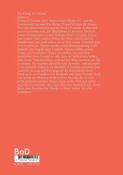 Der Klang der HerzenZeitreiseIn einem irischen Dorf, lebten Simon Moore 15 J. und die Geschwister Lea und Kim Byrne, 15 und 14 Jahre alt. Dieses Trio war unzertrennlich und die besten Freunde. Simon und Lea versprachen sich, mit 20ig Jahren zu heiraten. Doch an einem Sonntag gab es einen heftigen Streit zwischen Simon und seinem Vater, sodass Simon das Haus verließ und die Geschwister, nur noch sahen, wie er fort rannte. Plötzlich kam er in London an.. Simon machte einen Quantensprung in die Zukunft und vergaß seine Freunde. Simon erfüllte seinen Traum, ein berühmter Pianist zu werden. Lea und Kim vermissten ihren Freund so sehr, dass sie nach einem halben Jahr seines Verschwindens, sich auf den Weg machten, um ihn zu suchen. Sie machten ebenfalls eine Zeitreise und sprangen in die Zukunft wodurch sie ebenfalls in London ankamen. Lea studierte Gesang und Kim ging auf die Kunsthochschule. Doch auch sie vergaßen ihre Herkunft und ihren Freund. Doch ein Gefühl der Wehmut blieb in ihren Herzen, die sie sich nicht erklären konnten. Simon reiste in die USA und später auch die Geschwister, dass ihrer Karriere förderlich war. Diese Reise aber, brachte eine Wende in ihrem Leben, die alles veränderte.