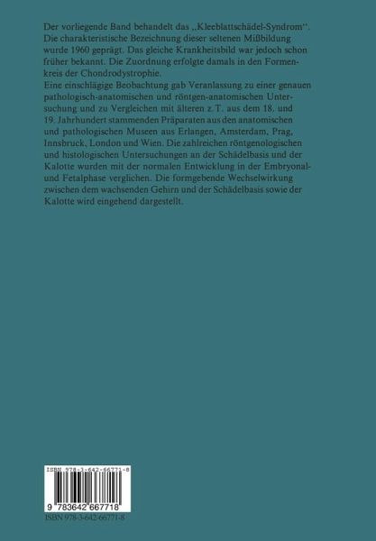 I. Definition des Kleeblattschädel-Syndroms nach Holtermüller und Wiedemann.- Material und Methode.- II. Beschreibung des Berliner Falles.- 1. Fallbericht.- 2. Äußere Besichtigung.- 3. Postmortale Röntgenuntersuchung und Sektionsbefunde.- III. Epikrise.- Besprechung des Berliner Falles.- IV. Nachuntersuchte Fälle.- 1. Amsterdam.- 2. London.- 3. Innsbruck.- 4. Erlangen.- 5. Prag.- 6. Wien.- V. Resümee.- 1. Neuuntersuchte Fälle und Berliner Fall.- 2. Vergleich der Bezeichnung der verschiedenen Kalottenabschnitte bei früheren Beschreibungen der von uns untersuchten Fälle.- VI. Besprechung der eigenen Ergebnisse mit Vergleich zu den übrigen in der Literatur erwähnten Fällen.- 1. Einteilung und Abgrenzung der verschiedenen.- Typen.- Gegenüberstellung und Einordnung aller in der Literatur beschriebenen Fälle nach unserer Typeneinteilung.- 2. Vergleich der Bezeichnung der verschiedenen Kalottenabschnitte bei den Beschreibungen der nicht von uns untersuchten Fälle.- VII. Pariser Nomenklatur der konstitutionellen Knochenerkrankungen.- Definition der Achondroplasie und des thanatophoren Zwergwuchses - Beispielhafte Schilderung unseres Berliner thanatophoren Zwergwuchses - Beziehung des Vrolikschen Typs des Kleeblatt- schädel-Syndroms zum thanatophoren Zwergwuchs.- VIII. Entwicklungsgeschichte.- IX. Entwicklungsablauf bei der Entstehung der verschiedenen Typen des Kleeblattschädel-Syndroms.- 1. Wechselbeziehungen zwischen dem Wachstum der Schädelbasis, des Gehirns und der Kalotte.- 2. Hypothetische Festlegung der von uns postulierten Störfaktoren.- X. Vorschläge für den Untersuchungsgang bei weiteren Fällen von Kleeblattschädel-Syndrom.- XI. Zusammenfassung.- Literatur.- Danksagung.