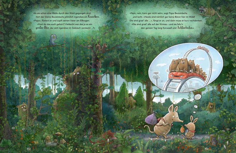 Der kleine Beuteldachs und sein Papa wollen die Oma besuchen. Und dazu müssen sie durch den Wald. Unheimlich!, findet der kleine Beuteldachs. Es knackt und raschelt hinter jedem Baum. Wer ist das? Werden sie verfolgt? »Die Tiere mit Geweih sind grad auf Hawaii«, beruhigt ihn sein Papa, dem noch so manch flotter Spruch einfällt. Und als schließlich der kleine Beuteldachs ganz mutig sogar einen Wolf anspricht, gibt es eine große Überraschung. Es sind die Tiere im Wald, die Angst vor den Beuteldachsen hatten. Warum nur? Bei einem gemeinsamen Picknick erzählen sie sich von ihrer Angst und schließen Freundschaft. Ganz schön mutig!