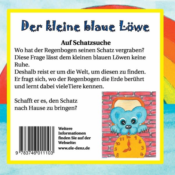 Wo hat der Regenbogen seinen Schatz vergraben? Diese Frage lässt dem kleinen blauen Löwen keine Ruhe. Deshalb reist er um die Welt, um diesen zu finden. Er fragt sich, wo der Regenbogen die Erde berührt und lernt dabei viele Tiere kennen.