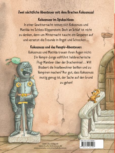 In diesem Doppelband erleben der kleine Drache Kokosnuss und seine Freunde zwei gruselige Abenteuer: Sie finden heraus, warum man auf Schloss Klippenstein ab 12 Uhr nachts keine Sekunde Ruhe findet. Danach lösen sie das Geheimnis um den Vampirjungen Bissbert, der die Dracheninsel in Angst und Schrecken versetzt.