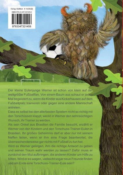 Der kleine Eulenjunge Werner ist schon von klein auf der weltgrößteFußballfan. Von einem Baum aus schaut er jedes Mal begeistert zu, wenndie Kinder aus Kickerhausen auf dem Fußballplatz trainieren oder gegeneine andere Mannschaft antreten.Dass es selbst bei den allerbesten Spielern nicht so richtig mit denTorschüssen klappt, weckt in Werner den sehnsüchtigen Wunsch, ihrTrainer zu werden.Als sein Onkel aus Brasilien die Familie besucht, erzählt er Werner vonden Kindern und den Torschuss-Trainer-Eulen in Brasilien. Ihr großesGeheimnis darf er aber nur mit seinem Neffen teilen, wenn er ihm eineFrage beantwortet, die überraschenderweise gar nichts mit Fußball zu tunhat.Wird es Werner gelingen, ihm die richtige Antwort zu geben und seinenTraum wahr werden zu lassen? Dafür muss er zunächst den Mut aufbringen,die anderen Kinder um Hilfe zu bitten. Wird er es wagen, vielleichtsogar neue Freunde finden und am Ende eine Torschuss-Trainer-Eule sein?Dieses Buch ist für fußballbegeisterte Mädchen und Jungen ab achtJahren, die gerne mitfiebern, lachen und träumen. Die ebenso spannendewie gefühlvolle Geschichte wird durch humorvolle Szenen aufgelockert.Auch ist das Buch ein tolles Vorlesebuch für die kleinen Kicker.Die Geschichte verbindet unsere heutige Realität mit einer Welt der Fantasie in der die Eulen sprechen können.Obwohl es hier vordergründig um den Fußball geht, vermittelt das Buch wichtige Botschaften; wie zum Beispielden Wert echter Freundschaft und die Bedeutung von Mitgefühl und Hilfsbereitschaft. Zusätzlich wird die Fragegestellt, ob wir dazu in der Lage sind, unsere Träumen zu verwirklichen wenn wir es von ganzem Herzen wollen.