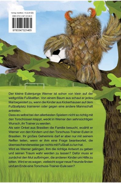 Der kleine Eulenjunge Werner ist schon von klein auf der weltgrößteFußballfan. Von einem Baum aus schaut er jedes Mal begeistert zu, wenndie Kinder aus Kickerhausen auf dem Fußballplatz trainieren oder gegeneine andere Mannschaft antreten.Dass es selbst bei den allerbesten Spielern nicht so richtig mit denTorschüssen klappt, weckt in Werner den sehnsüchtigen Wunsch, ihrTrainer zu werden.Als sein Onkel aus Brasilien die Familie besucht, erzählt er Werner vonden Kindern und den Torschuss-Trainer-Eulen in Brasilien. Ihr großesGeheimnis darf er aber nur mit seinem Neffen teilen, wenn er ihm eineFrage beantwortet, die überraschenderweise gar nichts mit Fußball zu tunhat.Wird es Werner gelingen, ihm die richtige Antwort zu geben und seinenTraum wahr werden zu lassen? Dafür muss er zunächst den Mut aufbringen,die anderen Kinder um Hilfe zu bitten. Wird er es wagen, vielleichtsogar neue Freunde finden und am Ende eine Torschuss-Trainer-Eule sein?Dieses Buch ist für fußballbegeisterte Mädchen und Jungen ab achtJahren, die gerne mitfiebern, lachen und träumen. Die ebenso spannendewie gefühlvolle Geschichte wird durch humorvolle Szenen aufgelockert.Auch ist das Buch ein tolles Vorlesebuch für die kleinen Kicker.Die Geschichte verbindet unsere heutige Realität mit einer Welt der Fantasie in der die Eulen sprechen können.Obwohl es hier vordergründig um den Fußball geht, vermittelt das Buch wichtige Botschaften; wie zum Beispielden Wert echter Freundschaft und die Bedeutung von Mitgefühl und Hilfsbereitschaft. Zusätzlich wird die Fragegestellt, ob wir dazu in der Lage sind, unsere Träumen zu verwirklichen wenn wir es von ganzem Herzen wollen.
