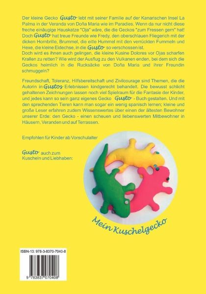 Der kleine Gecko Gusto lebt mit seiner Familie auf der Kanarischen Insel La Palma in der Veranda von Doña Maria wie im Paradies. Wenn da nur nicht diese freche einäugige Hauskatze "Oja" wäre, die die Geckos "zum Fressen gern" hat! Doch Gusto hat treue Freunde wie Fredy, den oberschlauen Fliegerich mit der dicken Hornbrille, Brummel, die eitle Hummel mit den verrückten Fummeln und Hexe, die kleine Eidechse, in die Gusto so verschossen ist. Doch wird es ihnen auch gelingen, die kleine Kusine Dolores vor Ojas scharfen Krallen zu retten? Wie wird der Ausflug zu den Vulkanen enden, bei dem sich die Geckos heimlich in die Rucksäcke von Doña Maria und ihrer Freundin schmuggeln? Freundschaft, Toleranz, Hilfsbereitschaft und Zivilcourage sind Themen, die die Autorin in Gustos Erlebnissen kindgerecht behandelt. Die bewusst schlicht gehaltenen Zeichnungen lassen noch viel Spielraum für die Fantasie der Kinder, und jedes kann so sein ganz eigenes Gecko Gusto - Buch gestalten. Und mit den sprechenden Tieren kann man sogar ein wenig spanisch lernen; kleine und große Leser erfahren zudem Wissenswertes über einen der ältesten Bewohner unserer Erde: den Gecko - einen scheuen und liebenswerten Mitbewohner in Häusern, Veranden und Terrassen.
