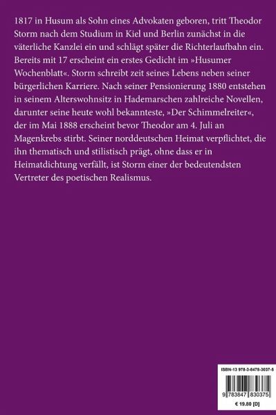 Theodor Storm: Der kleine Häwelmann / Hinzelmeier / Hans Bär. Drei Märchen Lesefreundlicher Großdruck in 16-pt-Schrift Großformat, 210 x 297 mm Berliner Ausgabe, 2019 Durchgesehener Neusatz mit einer Biographie des Autors bearbeitet und eingerichtet von Theodor Borken Der kleine Häwelmann: Erstdruck im »Volksbuch für das Jahr 1850 für Schleswig, Holstein und Lauenburg«. Hrsg. von Karl Leonhard Biernatzki, Altona 1850. Hinzelmeier: Erstdruck im »Volksbuch für das Jahr 1851 für Schleswig, Holstein und Lauenburg.« Hrsg. von Karl Leonhard Biernatzki, Altona 1850. Erschien unter dem Titel: »Stein und Rose. Ein Märchen«. Hans Bär: Erschien in »Schriften der Theodor-Storm-Gesellschaft 1«, Heide, Holst. (Boyens) 1952, S.9¿14. Textgrundlage ist die Ausgabe: Theodor Storm: Sämtliche Werke in vier Bänden. Herausgegeben von Peter Goldammer, Berlin und Weimar: Aufbau, 1967. Umschlaggestaltung von Thomas Schultz-Overhage unter Verwendung des Bildes: Ivan Aivazovsky, Sturm im Mondlicht, 1841. Gesetzt aus der Minion Pro, 16 pt. Über den Autor: 1817 in Husum als Sohn eines Advokaten geboren, tritt Theodor Storm nach dem Studium in Kiel und Berlin zunächst in die väterliche Kanzlei ein und schlägt später die Richterlaufbahn ein. Bereits mit 17 erscheint ein erstes Gedicht im »Husumer Wochenblatt«. Storm schreibt zeit seines Lebens neben seiner bürgerlichen Karriere. Nach seiner Pensionierung 1880 entstehen in seinem Alterswohnsitz in Hademarschen zahlreiche Novellen, darunter seine heute wohl bekannteste, »Der Schimmelreiter«, der im Mai 1888 erscheint bevor Theodor am 4. Juli an Magenkrebs stirbt. Seiner norddeutschen Heimat verpflichtet, die ihn thematisch und stilistisch prägt, ohne dass er in Heimatdichtung verfällt, ist Storm einer der bedeutendsten Vertreter des poetischen Realismus.