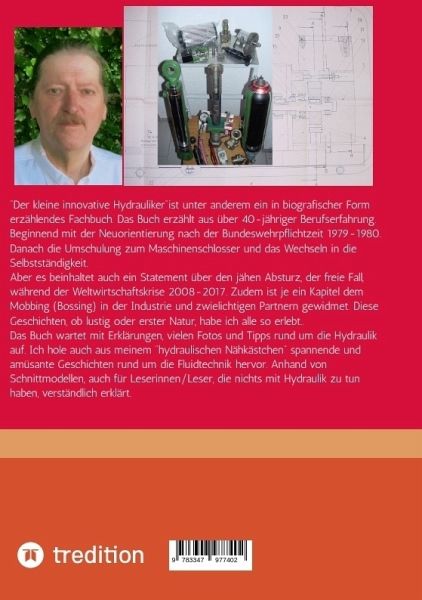 "Der kleine innovative Hydrauliker" ist unter anderem ein in biographischer Form erzählendes Fachbuch rund um die Hydraulik. Das Buch erzählt aus fast 40-jähriger Berufserfahrung. Beginnend mit der Neuorientierung nach der Bundeswehrpflichtzeit 1979-1980. Danach die Umschulung zum Maschinenschlosser und das Wechseln in die Selbstständigkeit. Aber es beinhaltet auch ein Statement über den jähen Absturz, der freie Fall, im ersten Drittel der Weltwirtschaftskrise 2008-2017. Zudem ist je ein Kapitel dem Mobbing (Bossing) in der Industrie und zwielichtigen Partnern gewidmet. Diese Geschichten, ob lustig oder ernster Natur, habe ich alle so erlebt. Das Buch wartet mit Erklärungen, vielen Fotos und Tipps rund um die Hydraulik auf. Ich hole auch aus meinem über 30-jährigen "hydraulischen Nähkästchen" spannende und amüsante Geschichten rund um die Fluidtechnik hervor. Anhand von Schnittmodellen, auch für Leser/innen, die nichts mit der Hydraulik zu tun haben, verständlich erklärt.