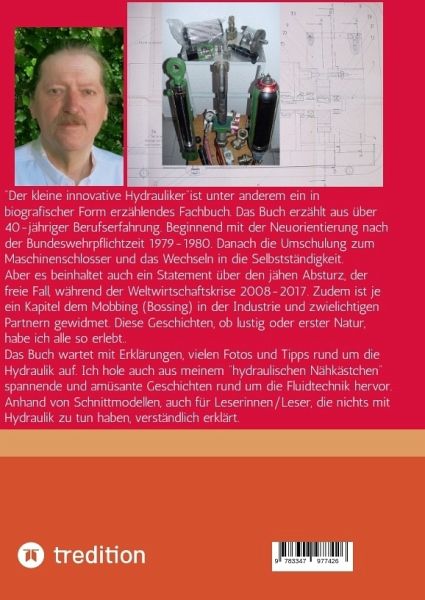 "Der kleine innovative Hydrauliker" ist unter anderem ein in biographischer Form erzählendes Fachbuch rund um die Hydraulik. Das Buch erzählt aus fast 40-jähriger Berufserfahrung. Beginnend mit der Neuorientierung nach der Bundeswehrpflichtzeit 1979-1980. Danach die Umschulung zum Maschinenschlosser und das Wechseln in die Selbstständigkeit. Aber es beinhaltet auch ein Statement über den jähen Absturz, der freie Fall, im ersten Drittel der Weltwirtschaftskrise 2008-2017. Zudem ist je ein Kapitel dem Mobbing (Bossing) in der Industrie und zwielichtigen Partnern gewidmet. Diese Geschichten, ob lustig oder ernster Natur, habe ich alle so erlebt. Das Buch wartet mit Erklärungen, vielen Fotos und Tipps rund um die Hydraulik auf. Ich hole auch aus meinem über 30-jährigen "hydraulischen Nähkästchen" spannende und amüsante Geschichten rund um die Fluidtechnik hervor. Anhand von Schnittmodellen, auch für Leser/innen, die nichts mit der Hydraulik zu tun haben, verständlich erklärt.