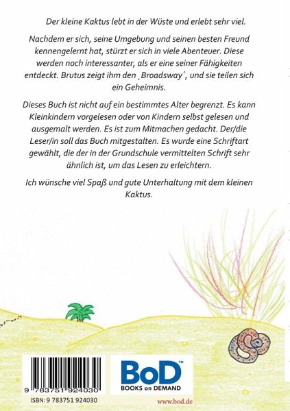 Der kleine Kaktus lebt in der Wüste und erlebt sehr viel. Nachdem er sich, seine Umgebung und seinen besten Freund Brutus kennengelernt hat, stürzt er sich in viele Abenteuer. Diese werden noch interessanter, als er eine seiner Fähigkeiten entdeckt. Brutus zeigt ihm den Broadsway, und sie teilen sich ein Geheimnis. Dieses Buch ist nicht auf ein bestimmtes Alter begrenzt. Es kann Kleinkindern vorgelesen oder von Kindern selbst gelesen und ausgemalt werden. Es ist zum Mitmachen gedacht. Der/die Leser/in soll das Buch mitgestalten. Der Fantasie sind keine Grenzen gesetzt.Es wurde eine Schriftart gewählt, die der in der Grundschule vermittelten Schrift sehr ähnlich und groß genug ist, um das Lesen für Klein und Groß zu erleichtern.Ich wünsche viel Spaß und gute Unterhaltung mit dem kleinen Kaktus.