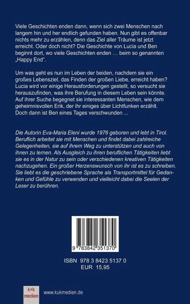 Viele Geschichten enden dann, wenn sich zwei Menschen nach langem hin und her endlich gefunden haben. Nun gibt es offenbar nichts mehr zu erzählen, denn das Ziel aller Träume ist nun erreicht. Oder doch nicht? Die Geschichte von Lucia und Ben beginnt dort, wo viele Geschichten enden ... beim so genannten "Happy End". Um was geht es nun im Leben der beiden, nachdem sie ein großes Lebensziel, das Finden der großen Liebe, erreicht haben? Lucia wird vor einige Herausforderungen gestellt, so versucht sie herauszufinden, was ihre Berufung in diesem Leben sein könnte. Auf ihrer Suche begegnet sie interessanten Menschen, wie dem geheimnisvollen Erik, der ihr einiges über Lichtfunken erzählt. Doch dann ist Ben eines Tages verschwunden ...