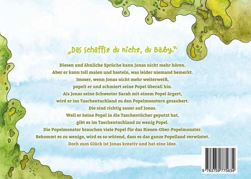 „Das schaffst du nicht, du Baby.“ Diesen und ähnliche Sprüche kann Jonas nicht mehr hören. Aber er kann toll malen und basteln, was leider niemand bemerkt. Immer, wenn Jonas nicht mehr weiterweiß, popelt er und schmiert seine Popel überall hin. Als Jonas seine Schwester Sarah mit einem Popel ärgert, wird er ins Taschentuchland zu den Popelmonstern gezaubert. Die sind richtig sauer auf Jonas. Weil er keine Popel in die Taschentücher geputzt hat, gibt es im Taschentuchland zu wenig Popel. Die Popelmonster brauchen viele Popel für das Riesen-Ober-Popelmonster. Bekommt es zu wenige, wird es so wütend, dass es das ganze Popelland verwüstet. Doch zum Glück ist Jonas kreativ und hat eine Idee.