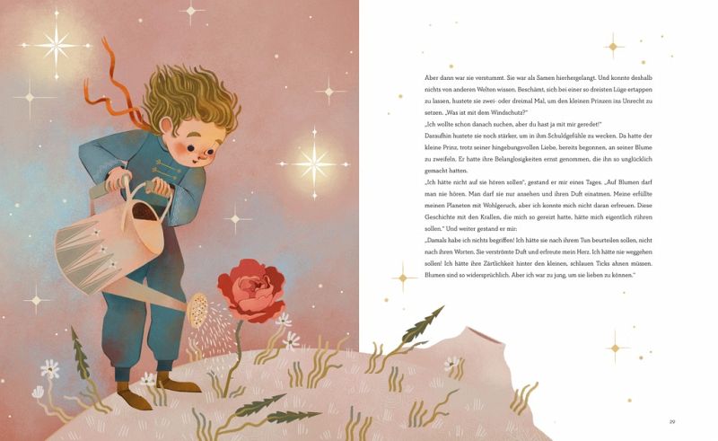 Freundschaft, Liebe, Mitmenschlichkeit, sich Zeit für die Dinge im Leben nehmen: Seit 80 Jahren fesselt die Geschichte des kleinen Prinzen Menschen aller Altersgruppen. Die traumhafte Geschichte eines Prinzen von einem fernen Stern, der auf der Erde den Menschen nur scheinbar einfache Fragen stellt, wurde in über hundert Sprachen übersetzt und ist eines der meistverkauften Bücher aller Zeiten. Claudia Bordin transportiert in dieser Neuausgabe für kleine Leser ab sieben Jahren die zeitlosen Weisheiten Antoine de Saint-Exupérys in exklusive, poetisch-moderne Illustrationen. Sie schafft ihre eigene Faszination und gestaltet ein vielschichtiges Leseerlebnis.