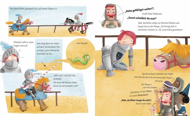 Der kleine Ritter Zartbitter soll beim Turnier mitmachen und gewinnen. Denn ansonsten wird er kein Ritter. Da ist sein Vater sehr deutlich. Doch Ritter Zartbitter mag keine Turniere. Lieber schaut er nach einer kleinen Raupe, die mitten auf dem Weg liegt, als zu kämpfen. Dafür wird er zum