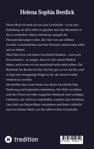 Dieses Buch ist mehr als nur eine Geschichte - es ist eine Einladung, an dich selbst zu glauben und das Besondere in dir zu entdecken. Sahras Abenteuer spiegelt die Herausforderungen wider, die viele von uns erleben: Zweifel, Unsicherheiten und den Wunsch, einfach man selbst sein zu dürfen.Mein Ziel ist es, mit dieser Geschichte Kindern - und auch Erwachsenen - zu zeigen, dass wir alle unsere Stärken haben, auch wenn wir sie manchmal nicht sofort sehen. Die Botschaft des Buches ist klar: Du bist gut, so wie du bist, und es liegt eine einzigartige Magie in dir, die darauf wartet, entdeckt zu werden.Ich möchte, dass Leser_innen aus dieser Geschichte Mut, Hoffnung und Inspiration mitnehmen. Die Welt von Sahra und den Tieren ist voller magischer Momente und wichtiger Lektionen, die nicht nur unterhalten, sondern auch berühren.Lass dich von Sahras Reise verzaubern und finde vielleicht auch ein kleines Stück von dir selbst in ihrer Geschichte.