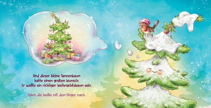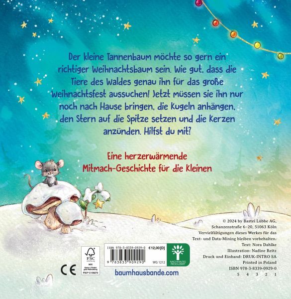 Sei, wie du bist, denn so bist du perfekt! Ein interaktives Mitmachbuch, das die Fantasie anregt, die Feinmotorik fördert und jede Vorlesezeit in ein gemeinsames Erlebnis verwandelt. Ideal als Weihnachtsgeschenk für Kinder ab 2 Jahren.Der kleine Tannenbaum wünscht sich nichts sehnlicher, als ein richtiger Weihnachtsbaum zu sein. Doch er hat hier ein paar Ecken und dort ein paar Kanten, sodass alle anderen Weihnachtsbäume vor ihm abgeholt werden. Einsam und allein steht er schließlich auf der Lichtung. Bis die Tiere des Waldes vorbeikommen. Denn sie haben niemand anderen als den kleinen Tannenbaum für das große Weihnachtsfest im Wald gesucht! Jetzt brauchen sie nur noch Hilfe von einem kleinen Leser oder einer kleinen Leserin: Die Kugeln müssen angehängt, der Stern auf die Spitze gesetzt und die Kerzen angezündet werden. Machst du mit?Mit warmherzigen und stimmungsvollen Illustrationen von Nadine Reitz