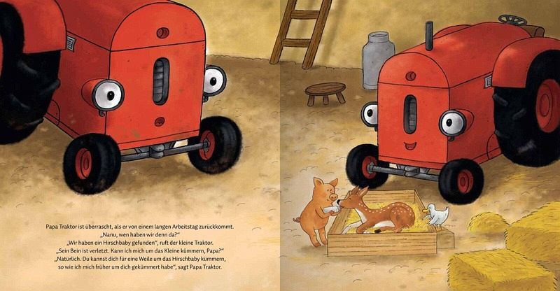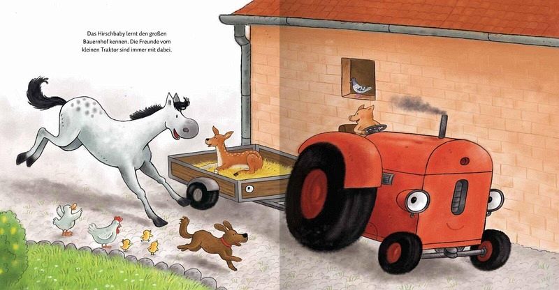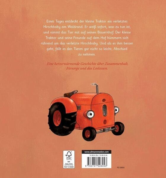 Eines Tages entdeckt der kleine Traktor ein verletztes Hirschbaby am Waldrand. Er weiß sofort, was zu tun ist, und nimmt das Tier mit auf seinen Bauernhof. Der kleine Traktor und seine Freunde auf dem Hof kümmern sich rührend um das verletzte Hirschbaby. Und als es ihm besser geht, fällt es den Tieren gar nicht so leicht, Abschied zu nehmen. Eine herzerwärmende Geschichte über Zusammenhalt, Fürsorge und das Loslassen.