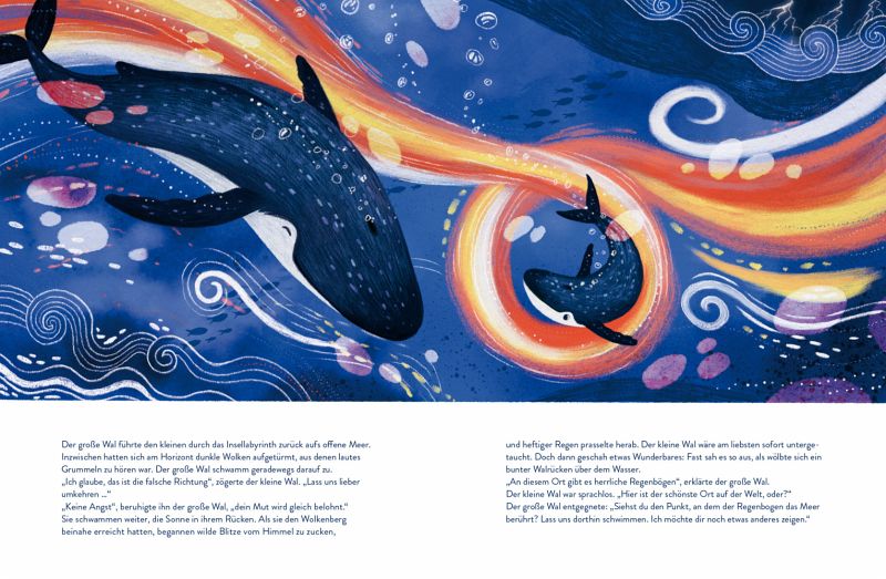 Ganz besonders toll finde ich es, dass hier nicht konkret über Mama-Wal mit Baby-Wal oder Papa-Wal mit Baby-Wal geschrieben wird, sondern dass man den beiden Walen verschiedenste Konstellationen zuweisen kann. So kann man die Geschichte der beiden Wale perfekt an die eigene Familienkonstellation oder wie auch immer es gerade passt und wie man möchte, auslegen. Ich finde das einfach prima!