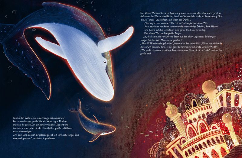 Der kleine Wal schläft glücklich und zufrieden an den großen Wal gekuschelt ein. Abschließend flüstert der große Wal dem kleinen, schlafenden Wal das große Wal-Geheimnis zu... dass der schönste Ort der Welt dort ist, wo man zusammen glücklich ist!