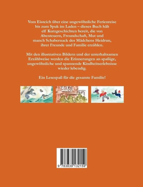 Es war einmal ...... So oder so ähnlich könnten die Geschichten in dem vorliegenden Buch beginnen, denn worüber und über wen erzählt wird, war einmal.Vom Eisteich über eine ungewöhnliche Ferienreise bis zum Spuk im Laden - dieses Buch hält elf Kurzgeschichten bereit, die von Abenteuern, Freundschaft, Mut und manch Schabernack des Mädchens Heidrun, ihrer Freunde und Familie erzählen. Mit den illustrativen Bildern und der unterhaltsamen Erzählweise werden die Erinnerungen an spassige, ungewöhnliche und spannende Kindheitserlebnisse wieder lebendig.Das Buch ist für Kinder von 4 - 11 Jahren zum Vor- und Selberlesen.Ein Lesespass für die gesamte Familie!Alle Zeichnungen stammen von der Autorin.