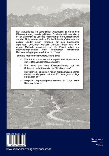 Der Skitourismus im bayerischen Alpenraum ist durch eine Klimaerwärmung massiv gefährdet. Durch diese Untersuchung sollen Erkenntnisse über die Auswirkung einer Klimaänderung auf den Skitourismus, welche für die Schweiz, Österreich und andere Länder schon vorliegen, für den bayerischen Alpenraum gewonnen werden. Darüber hinaus wird eine eigene Methode entwickelt, um die Einsetzbarkeit von Beschneiungsanlagen unter veränderten klimatischen Rahmenbedingungen abschätzen zu können. Ziel dieser Untersuchung ist festzustellen, in welchem Ausmaß die Skigebiete betroffen sein werden und was für Anpassungsmöglichkeiten in Frage kommen. Dabei können aber keine exakten Prognosen über ein zukünftiges Klima gegeben werden, sondern nur Abschätzungen, die auf eigenen Untersuchungen, sowie Studien Dritter beruhen. Zentrale Fragen dieser Untersuchung sind: Wie hat sich das Klima im bayerischen Alpenraum in den letzten Jahrzehnten entwickelt? Wie wirkt sich eine Klimaerwärmung auf die Schneesicherheit bayerischer Skigebiete aus? Mit welchen Problemen haben Seilbahnunternehmen derzeit zu kämpfen und was für Lösungsvorschläge bieten sich an? Mögliche Anpassungsmaßnahmen im Zuge einer Klimaerwärmung