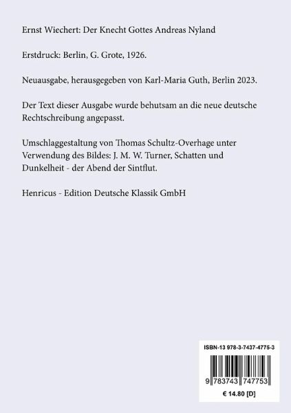 Ernst Wiechert: Der Knecht Gottes Andreas Nyland. RomanErstdruck: Berlin, G. Grote, 1926.Neuausgabe, herausgegeben von Karl-Maria Guth, Berlin 2023.Der Text dieser Ausgabe wurde behutsam an die neue deutsche Rechtschreibung angepasst.Umschlagabbildung: J. M. W. Turner, Schatten und Dunkelheit - der Abend der SintflutGesetzt aus der Minion Pro, 11 pt.Henricus - Edition Deutsche Klassik GmbHÜber den Autor:1887 in Kleinort in Masuren als Sohn eines Försters geboren, studiert Ernst Wiechert in Königsberg, lehrt ebendort als Studienrat und heiratet 1912 Meta Mittelstädt. 1914 meldet er sich freiwillig zum Kriegsdienst; er wird mehrfach verwundet und mit dem Eisernen Kreuz I. und II. Klasse ausgezeichnet. In den Kriegsjahren entstehen seine ersten Erzählungen. Nach dem Selbstmord seiner Frau übersiedelt er 1930 nach Berlin, heiratet 1932 erneut und gibt 1933 den Lehrerberuf auf, um in Bayern als freier Schriftsteller zu leben. Er wird von den Nationalsozialisten drangsaliert und schließlich 1938 verhaftet. Nach Protesten aus dem In- und Ausland kommt der inzwischen prominente Autor auf freien Fuß, muss sich aber an strenge Auflagen halten; er wählt den Weg der Inneren Emigration und bleibt in Deutschland. Erst nach dem Krieg geht er in die Schweiz. Am 24. August 1950 stirbt mit Ernst Wiechert einer der meistgelesenen Autoren seiner Zeit.