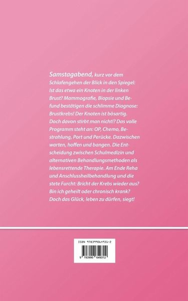 Samstagabend, kurz vor dem Schlafengehen der Blick in den Spiegel: Ist das etwa ein Knoten in der linken Brust? Mammografie, Biopsie und Befund bestätigen die schlimme Diagnose: Brustkrebs! Der Knoten ist bösartig. Doch davon stirbt man nicht!? Das volle Programm steht an: OP, Chemo, Bestrahlung, Port und Perücke. Dazwischen warten, hoffen und bangen. Die Entscheidung zwischen Schulmedizin und alternativen Behandlungsmethoden als lebensrettende Therapie. Am Ende Reha und Anschlussheilbehandlung und die stete Furcht: Bricht der Krebs wieder aus? Bin ich geheilt oder chronisch krank? Doch das Glück, leben zu dürfen, siegt!
