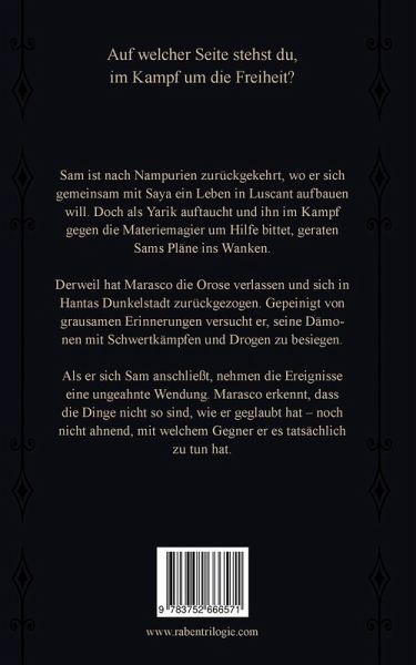 Auf welcher Seite stehst du, im Kampf um die Freiheit?Sam ist nach Nampurien zurückgekehrt, wo er sich gemeinsam mit Saya ein Leben in Luscant aufbauen will. Doch als Yarik auftaucht und ihn im Kampf gegen die Materiemagier um Hilfe bittet, geraten Sams Pläne ins Wanken.Derweil hat Marasco die Orose verlassen und sich in Hantas Dunkelstadt zurückgezogen. Gepeinigt von grausamen Erinnerungen versucht er, seine Dämonen mit Schwertkämpfen und Drogen zu besiegen.Als er sich Sam anschliesst, nehmen die Ereignisse eine ungeahnte Wendung. Marasco erkennt, dass die Dinge nicht so sind, wie er geglaubt hat - noch nicht ahnend, mit welchem Gegner er es tatsächlich zu tun hat.Ein fesselndes Fantasyepos für Erwachsene und alle, die Raben, Seher, Schwertkämpfer und Magier lieben.Der Kodex der Magier ist der dritte Teil der Raben Trilogie.