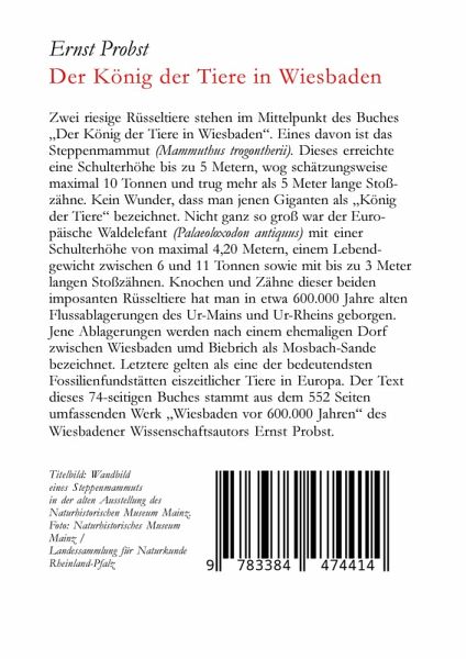 Zwei riesige Rüsseltiere stehen im Mittelpunkt des Buches "Der König der Tiere in Wiesbaden". Eines davon ist das Steppenmammut (Mammuthus trogontherii). Dieses erreichte eine Schulterhöhe bis zu 5 Metern, wog schätzungsweise maximal 10 Tonnen und trug mehr als 5 Meter lange Stoßzähne. Kein Wunder, dass man jenen Giganten als "König der Tiere" bezeichnet. Nicht ganz so groß war der Europäische Waldelefant (Palaeoloxodon antiquus) mit einer Schulterhöhe von maximal 4,20 Metern, einem Lebendgewicht zwischen 6 und 11 Tonnen sowie mit bis zu 3 Meter langen Stoßzähnen. Knochen und Zähne dieser beiden imposanten Rüsseltiere hat man in etwa 600.000 Jahre alten Flussablagerungen des Ur-Mains und Ur-Rheins geborgen. Jene Ablagerungen werden nach einem ehemaligen Dorf zwischen Wiesbaden und Biebrich als Mosbach-Sande bezeichnet. Letztere gelten als eine der bedeutendsten Fossilienfundstätten eiszeitlicher Tiere in Europa. Der Text dieses 74-seitigen Buches stammt aus dem 552 Seiten umfassenden Werk "Wiesbaden vor 600.000 Jahren" des Wiesbadener Wissenschaftsautors Ernst Probst.