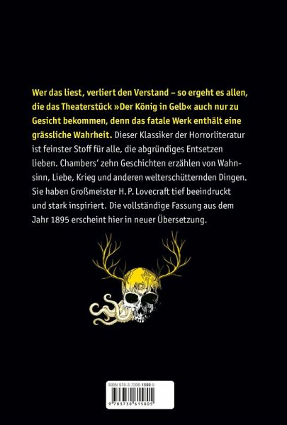 Wer das liest, verliert den Verstand - so ergeht es allen, die das Theaterstück »Der König in Gelb« auch nur zu Gesicht bekommen, denn das fatale Werk enthält eine grässliche Wahrheit. Dieser Klassiker der Horrorliteratur ist feinster Stoff für alle, die abgründiges Entsetzen lieben. Chambers' zehn Geschichten erzählen von Wahnsinn, Liebe, Krieg und anderen welterschütternden Dingen. Sie haben Großmeister H. P. Lovecraft tief beeindruckt und stark inspiriert. Die vollständige Ausgabe aus dem Jahr 1895 erscheint hier in neuer Übersetzung.