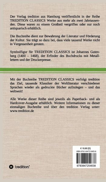 Diese Hardcover-Ausgabe ist Teil der TREDITION CLASSICS. Der Verlag tredition aus Hamburg veröffentlicht in der Buchreihe TREDITION CLASSICS Werke aus mehr als zwei Jahrtausenden. Diese waren zu einem Großteil vergriffen oder nur noch antiquarisch erhältlich. Mit TREDITION CLASSICS verfolgt tredition das Ziel, tausende Klassiker der Weltliteratur verschiedener Sprachen wieder als gedruckte Bücher zu verlegen und das weltweit! Die Buchreihe dient zur Bewahrung der Literatur und Förderung der Kultur. Sie trägt so dazu bei, dass viele tausend Werke nicht in Vergessenheit geraten.