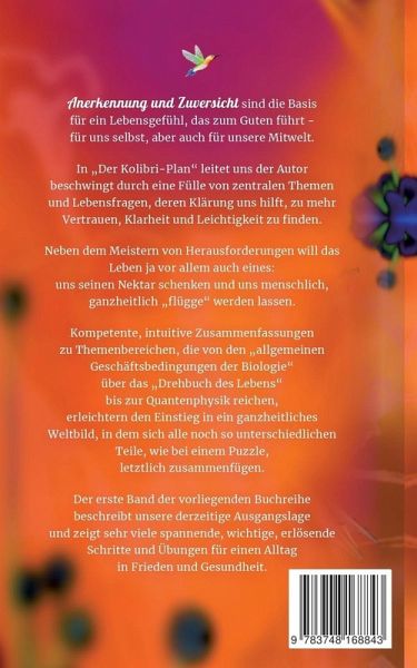 Anerkennung und Zuversicht sind die Basis für ein Lebensgefühl, das zum Guten führt - für uns selbst, aber auch für unsere Mitwelt.In "Der Kolibri-Plan" leitet uns der Autor beschwingt durch eine Fülle von zentralen Themen und Lebensfragen, deren Klärung uns hilft, zu mehr Vertrauen, Klarheit und Leichtigkeit zu finden. Neben dem Meistern von Herausforderungen will das Leben ja vor allem auch eines: uns seinen Nektar schenken und uns menschlich, ganzheitlich "flügge" werden lassen. Kompetente, intuitive Zusammenfassungen zu Themenbereichen, die von den "allgemeinen Geschäftsbedingungen der Biologie" über das "Drehbuch des Lebens" bis zur Quantenphysik reichen, erleichtern den Einstieg in ein ganzheitliches Weltbild, in dem sich alle noch so unterschiedlichen Teile, wie bei einem Puzzle, letztlich zusammenfügen.Der erste Band der vorliegende Buchreihe beschreibt unsere derzeitige Ausgangslage und zeigt sehr viele spannende, wichtige, erlösende Schritte und Übungen für einen Alltagin Frieden und Gesundheit.