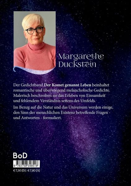 Margarethe Duckstein (vorher Dudzinski, geb. Raciniewska), Jahrgang 1953, wurde in Polen geboren, wo sie ihr halbes Leben verbracht hat. Seitdem lebt sie in Deutschland. Dipl.-Ingenieurin von Beruf, arbeitete sie viele Jahre in Polen und Deutschland als Bauingenieurin und Architektin. Poetin aus Berufung, konnte sie ihre Poesie erst nach dem Beenden ihrer beruflichen Karriere und ihrer Pflichten der Familie gegenüber zu Papier bringen. Sie schreibt in zwei Sprachen: Deutsch und Polnisch. Kunst und Literatur, vor allem die Poesie, waren immer ihre größte Leidenschaft. Die zweitgrößte sind Reisen, besonders nach Südafrika, das sie beinah als ihr zweites Zuhause betrachtet. Ihr Verstand ist logisch und scharf, aber ihre Seele ist romantisch, empfindsam und verletzlich. Viele Ereignisse in ihrem Leben, auch die tragischen in der Kindheit, haben einen großen Einfluss auf ihre Dichtkunst: der frühe Verlust ihrer Mutter, das Leben in Polen in der Zeit der Volksrepublik, die Umsiedlung nach Deutschland 1989, Reisen in die Welt. Eine Mischung aus Wissen, Romantik, Traurigkeit und Schwermut, aber auch die Begeisterung über die Schönheit des Universums und der Welt spiegelt sich in ihren Gedichten und verleiht ihnen eine melancholische Note. Bis jetzt wurde in Deutschland ihr Gedichtband "Der Komet genannt Leben" veröffentlicht. In Polen erschienen: die polnische Version des Gedichtbandes "Der Komet genannt Leben", unter dem Titel "Kometa zwana ¿yciem", sowie ein zweisprachiger Gedichtband "Zapisane w wodzie / Gespeichert im Wasser". Sie hat zwei Kinder und drei Enkel. Mit ihrem zweiten Mann, Rudolf Duckstein, lebt sie in Tespe bei Hamburg.