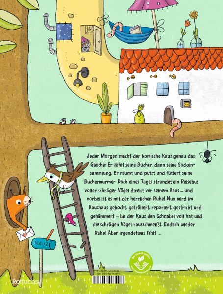 Jeden Morgen macht der komische Kauz genau das Gleiche: Er zählt seine Bücher, dann seine Sockensammlung. Er räumt und putzt und füttert seine Bücherwürmer. Herrlich findet er das! Doch eines Tages rumpelt und scheppert es, und vor seiner Tür stehen lauter schräge Vögel, deren Reisebus eine Panne hat. Vorbei ist es mit dem ruhigen Leben - der Reparaturvogel erkennt mit scharfem Blick und gezücktem Werkzeug alle kaputten Dinge im Haus, die Opernsängerin trällert ohne Unterlass, und die Köchin nimmt die Küche in Beschlag. Der Ökovogel strickt, und der Bibliotheksvogel sucht mit Kennerblick das Lesefutter. Es wird gekocht, geträllert, gehämmert und gestrickt, bis der Kauz den Schnabel voll hat und alle wieder rausschmeißt. Endlich wieder Ruhe! Aber irgendetwas fehlt ...