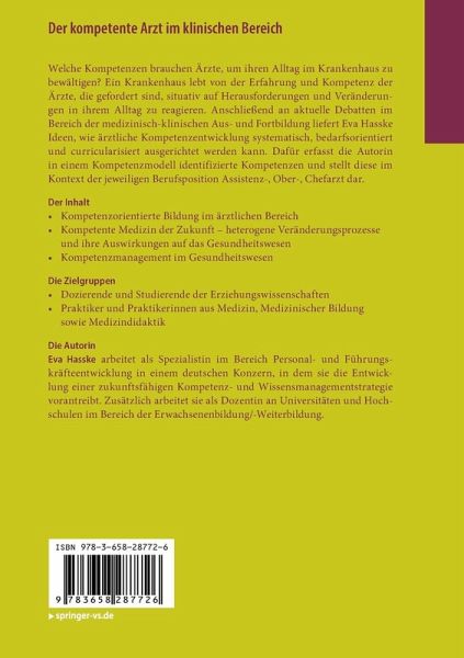 Welche Kompetenzen brauchen Ärzte, um ihren Alltag im Krankenhaus zu bewältigen? Ein Krankenhaus lebt von der Erfahrung und Kompetenz der Ärzte, die gefordert sind, situativ auf Herausforderungen und Veränderungen in ihrem Alltag zu reagieren. Anschließend an aktuelle Debatten im Bereich der medizinisch-klinischen Aus- und Fortbildung liefert Eva Hasske Ideen, wie ärztliche Kompetenzentwicklung systematisch, bedarfsorientiert und curricularisiert ausgerichtet werden kann. Dafür erfasst die Autorin in einem Kompetenzmodell identifizierte Kompetenzen und stellt diese im Kontext der jeweiligen Berufsposition Assistenz-, Ober-, Chefarzt dar.
