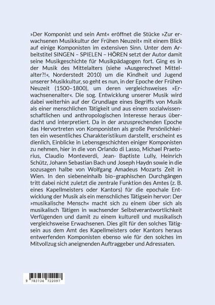 "Der Komponist und sein Amt" eröffnet die Stücke "Zur erwachsenen Musikkultur der Frühen Neuzeit" mit einem Blick auf einige Komponisten im extensiven Sinn. Unter dem Arbeitstitel "Singen - Spielen - Hören" setzt der Autor damit seine Musikgeschichte für Musikpädagogen fort. Ging es in der Musik des Mittelalters (siehe "Ausgerechnet Mittelalter?!", Norderstedt 2010) um die "Kindheit und Jugend unserer Musikkultur", so geht es nun, in der Epoche der Frühen Neuzeit (1500-1800), um deren vergleichsweises Erwachsenenalter. Die sog. Entwicklung unserer Musik wird dabei weiterhin auf der Grundlage eines Begriffs von Musik als einer menschlichen Tätigkeit und aus einem sozialwissenschaftlichen und anthropologischen Interesse heraus überdacht und interpretiert. Da in der anzusprechenden Epoche das Hervortreten von Komponisten als große Persönlichkeiten ein wesentliches Charakteristikum bildet, erscheint es dienlich, Einblicke in Lebensgeschichten einiger Komponisten zu nehmen, hier in die von Orlando di Lasso, Michael Praetorius, Claudio Monteverdi, Jean-Baptiste Lully, Heinrich Schütz, Johann Sebastian Bach und Joseph Haydn sowie in die sozusagen halbe von Wolfgang Amadeus Mozarts Zeit in Wien. In den siebeneinhalb bio-graphischen Durchgängen tritt dabei nicht zuletzt die zentrale Funktion des Amtes (z. B. eines Kapellmeisters oder Kantors) für die epochale Entwicklung der Musik als ein menschliches Tätigsein hervor: Der "musikalische Mensch" macht sich zu einem über sich als musikalisch Tätigen in wachsender Selbstverantwortlichkeit Verfügenden und damit zu einem kulturell und musikalisch vergleichsweise Erwachsenen. Dies gilt für den solches Tätigsein aus dem Amt des Kapellmeisters oder Kantors heraus entwerfenden Komponisten ebenso wie für den solches sich im Mitvollzug aneignenden Auftraggeber und Adressaten.