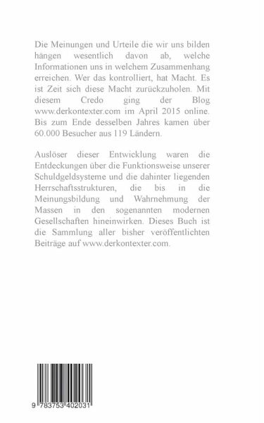 Die Meinungen und Urteile, die wir uns bilden, haengen wesentlich davon ab, welche Informationen uns in welchem Zusammenhang erreichen. Wer das kontrolliert, hat Macht. Es ist Zeit, sich diese Macht zurueckzuholen. Mit diesem Credo ging der Blog www.derkontexter.com im April 2015 online. Bis zum Ende desselben Jahres kamen ueber 60.000 Besucher aus 119 Laendern.Auslöser dieser Entwicklung waren die Entdeckungen ueber die Funktionsweise unserer Schuldgeldsysteme und die dahinter liegenden Herrschaftsstrukturen, die bis in die Meinungsbildung und Wahrnehmung der Massen in den sogenannten modernen Gesellschaften hineinwirken. Dieses Buch ist die Sammlung aller bisher veroeffentlichten Beitraege auf www.derkontexter.com.