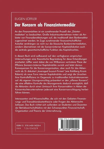 Dies ist ein wichtiges Buch für die Theorie der Finanzmärkte und die Zukunft der Finanzintermediation. Wir erleben derzeit an den Märkten, daß Banken mehr und mehr aus den Kreditketten herausfallen, ein Prozeß, der unter dem Schlagwort "disintermediation" bekannt wurde. Das bedeutet, daß Konzernzentralen mehr und mehr in die Rolle von Banken schlüpfen, zumindest was den Kredit betrifft. Die Senkung der Kreditkosten, die man sich davon verspricht, wird freilich in der Regel mit einer Erhöhung der Eigenkapitalkosten der betreffenden Konzerne erkauft. Diese Beobachtung, die derzeit noch als Randerscheinung gewertet werden kann, wirft doch mit die ganz grundsätzliche Frage auf, wie denn der Finanzintermediär der Zukunft aussieht, hieße er nun "Bank" oder "Konzernzentrale". Eugen Löffler wirft diese Frage in aller Radikalität theoretisch und auf der Grundlage alles verfügbaren empirischen Materials auf. Seine Lösung ist einmal der sogenannte offene Konzern, zum anderen ein neuer Typ einer Finanzholding, wie sie etwa von Kohlberg, Kravis und Roberts verkörpert wird. Ich glaube, daß es noch andere Lösungen für die effiziente Finanzintermediation gibt. Das Verdienst dieser Arbeit liegt freilich auch weniger in der Lösung des Problems, als in seiner theoretisch sauberen Präsentation. Hier, wie so oft, ist die richtige Problemstellung schon der größte Teil der Problemlösung. WOLFRAM ENGELS Vorwort Die vorliegende Arbeit wurde im wintersemester 1989/90 vom Fach bereich Wirtschaftswissenschaften der Johann Wolfgang Goethe-Uni versität in Frankfurt am Main als Dissertation angenommen. Mein besonderer Dank gilt Herrn Prof. Dr.