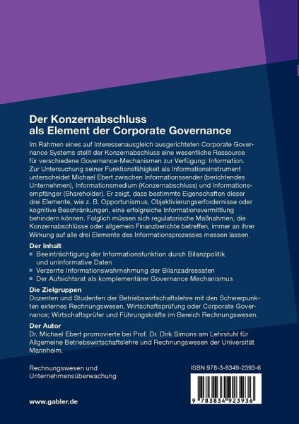 Im Rahmen eines auf Interessenausgleich ausgerichteten Corporate Governance Systems stellt der Konzernabschluss eine wesentliche Ressource für verschiedene Governance-Mechanismen zur Verfügung - Information. Zur Untersuchung seiner Funktionsfähigkeit als Informationsinstrument unterscheidet Michael Ebert zwischen Informationssender (berichtendes Unternehmen), Informationsmedium (Konzernabschluss) und Informationsempfänger (Shareholder). Er zeigt, dass bestimmte Eigenschaften dieser drei Elemente, wie z.B. Opportunismus, Objektivierungserfordernisse oder kognitive Beschränkungen, eine erfolgreiche Informationsvermittlung behindern können. Folglich müssen sich regulatorische Maßnahmen, die Konzernabschlüsse oder allgemein Finanzberichte betreffen, immer an ihrer Wirkung auf alle drei Elemente des Informationsprozesses messen lassen.