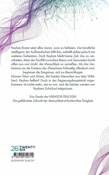 Das Finale der KREATOR-TRILOGIE: Die gefährdete Zukunft der Menschheit erfordert ihre Einigkeit.Keylam Baine setzt alles daran, Juna zu befreien. Die künstliche Intelligenz der Außerirdischen hilft ihm, enthüllt dabei jedoch ein weiteres Geheimnis. Doch Keylam bleibt keine Zeit, das zu verarbeiten, denn der Konflikt zwischen Retros und Zenonisten bricht offen aus und droht, die Menschheit zu zerreißen. Als das Geheimnis um die Existenz der Zheeylaner frühzeitig offenbart wird, beginnen die Ereignisse, sich zu überschlagen.Können Triton und Mana, die beiden Menschen aus dem Wildland, Keylam helfen? Doch in der Regierungshauptstadt angekommen, ist nichts mehr, wie es war, und die beiden werden von Keylams Schicksal mitgerissen.