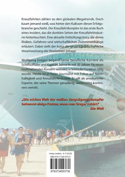Kreuzfahrten zählen zu den globalen Megatrends. Doch kaum jemand weiß, was hinter den Kulissen dieser Erfolgsbranche geschieht. "Der Kreuzfahrtkomplex" ist das erste Buch eines Insiders, das die dunklen Seiten der Kreuzfahrtindustrie beleuchtet. Eine aktuelle Enthüllungsstory, die deren Mechanismen, Risiken und wirtschaftlichen Zusammenhänge erläutert. Sicherheitslücken an Bord, prekäre Arbeitsbedingungen der Besatzung, fehlende Steuergerechtigkeit und bleibende Umweltbelastungen - Wolfgang Gregor zeigt eindringlich, welche gesamtgesellschaftliche Herausforderung das große Geschäft mit den Ozeanlinern birgt.