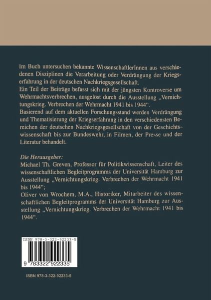 Wehrmacht und Vernichtungskrieg zwischen Gesellschaftspolitik, Wissenschaft und individueller Verarbeitung der Geschichte.- Die Wehrmacht als Ort des Widerstands - Mythos und Wirklichkeit.- Der militärische Widerstand und derÜbergang zum Rassenvernichtungskrieg.- Zur Mythologie der Nachkriegszeit. Die NS-Wehrmacht als "Zelle des Widerstands"und als Fluchtpunkt der "inneren Emigration".- Von "Furchtbaren Juristen" und ihrer Sorge um die "Schlagkraft der Truppe". Deserteure der Wehrmacht und die Wehrmachtsjustiz in der Nachkriegszeit.- Der Zweite Weltkrieg in den Medien.- Gegenerinnerungen seit 1945: Filmbilder, die Millionen sahen.- Der Zweite Weltkrieg und der Holocaust im Fernsehen der fünfziger und frühen sechziger Jahre.- Viele Taten, wenig Täter. Die Wehrmacht als Sujet neuerer Dokumentationsserien des öffentlich-rechtlichen Rundfunks.- Nachwirkungen des Krieges in Wissenschaft und Gesellschaft.- Kriegsgefangene und ihre Heimkehr.- Keine Helden mehr. Die Wehrmachtselite in der öffentlichen Auseinandersetzung.- Helden und Opfer. Zwischen Pietät und Politik: Die Toten der Kriege und der Gewaltherrschaft in Deutschland im 20. Jahrhundert.- Die Viktimisierungsfalle. Wehrmachtsverbrechen, Geschichtswissenschaft und symbolische Ordnung des Militärs.- Zur Funktion neurechter Freund-Feindbilder in Geschichte und Gegenwart der Bundesrepublik.- Ländervergleiche.- Vernichtungskrieg und Judenmord in den Schulbüchern beider deutschen Staaten seit 1949.- Militarismus und Antifaschismus. Die Wehrmacht im kollektiven Gedächtnis der DDR.- "Das ist ein deutsches Problem." Das Wehrmachtsbild und die Rezeption der Ausstellung "Vernichtungskrieg" in Norwegen.- Eine Ausstellung und ihr Kontext.- Was man will und was daraus wird. Gedanken über einprognostisches Versagen.- Erinnerung und Abwehr. Widersprüchliche Befunde zur Rezeption der Ausstellung "Vernichtungskrieg".- Die Rezeption der Ausstellung "Vernichtungskrieg" in Leserbriefen.- Soldatenverbände gegen die Ausstellung "Vernichtungskrieg" - Der lange Schatten des letzten Wehrmachtsberichts.- Wider die Erinnerung. Der mediale Diskurs um die Ausstellung "Vernichtungskrieg".- Vom Mythos zur Mikrologie? Zur öffentlichen Differenzierung von Täterbildern infolge der Ausstellung "Vernichtungskrieg".- Die Autorinnen und Autoren.- Danksagung.