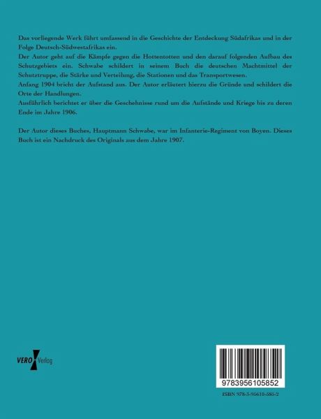 Der Autor geht auf die Kämpfe gegen die Hottentotten und den darauf folgenden Aufbau des Schutzgebiets ein. Schwabe schildert in seinem Buch die deutschen Machtmittel der Schutztruppe, die Stärke und Verteilung, die Stationen und das Transportwesen.