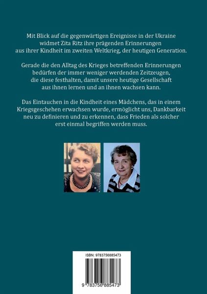 Mit Blick auf die gegenwärtigen Ereignisse in der Ukrainewidmet Zita Ritz ihre prägenden Erinnerungen aus ihrer Kindheit im zweiten Weltkrieg, der heutigen Generation.Gerade die den Alltag des Krieges betreffenden Erinnerungenbedürfen der immer weniger werdenden Zeitzeugen,die diese festhalten, damit unsere heutige Gesellschaftaus ihnen lernen und an ihnen wachsen kann.Das Eintauchen in die Kindheit eines Mädchens, das in einemKriegsgeschehen erwachsen wurde, ermöglicht uns, Dankbarkeitneu zu definieren und zu erkennen, dass Frieden als solchererst einmal begriffen werden muss.
