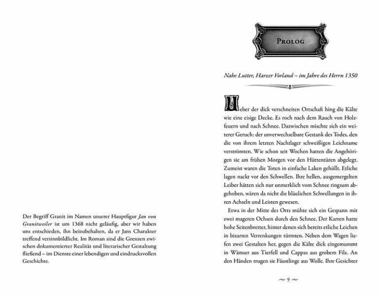 Manfred Schumacher hat einen spannenden historischen Kriminalroman geschrieben. Seine Hauptfigur Jan von Granitweiler, der von allen Granit genannt werden möchte, ist ein scharfsinniger Ermittler, der sich nicht von Aberglauben täuschen lässt. Er findet Spuren, wo andere keine gesehen haben und erkennt schnell, wo die Gefahr lauert. Das hält den Täter jedoch nicht davon ab, weiter seinem Treiben nachzugehen. Granit zur Seite steht Giso Bolender, ein junger Mann aus Goslar, der nicht nur lesen und schreiben kann, sondern auch andere Talente hat und damit Granit unterstützen kann.