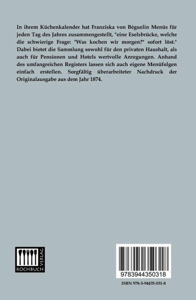 In ihrem Küchenkalender hat Franziska von Béguelin Menüs für jeden Tag des Jahres zusammengestellt, "eine Eselsbrücke, welche die schwierige Frage: "Was kochen wir morgen?" sofort löst." Dabei bietet die Sammlung sowohl für den privaten Haushalt, als auch für Pensionen und Hotels wertvolle Anregungen. Anhand des umfangreichen Registers lassen sich auch eigene Menüfolgen einfach erstellen. Sorgfältig überarbeiteter Nachdruck der Originalausgabe aus dem Jahr 1874.
