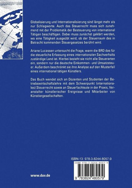 Ariane Lucassen untersucht die Frage, wann die BRD das für die steuerliche Erfassung eines internationalen Sachverhalts zuständige Land ist. Hierbei bezieht sie nicht alle Steuerarten ein, sondern nur die deutsche Einkommen- und Umsatzsteuer. Außerdem beschränkt sie ihre Analyse auf den Musterfall eines international tätigen Künstlers.